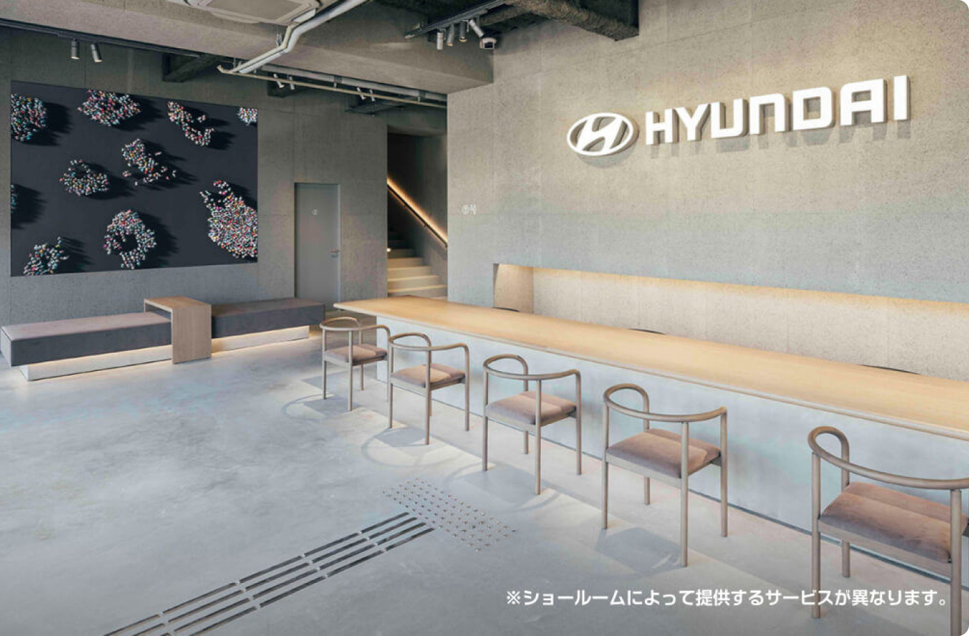 お客様にHyundaiのEV車およびブランドをご体験いただくため、 Hyundaiショールームを設けております。 Hyundaiショールームでは、展示車を通じて車両の魅力をご体感いただくと共に、 試乗体験や専門スタッフによる購入サポートをご提供いたします。 是非、お近くのHyundaiショールームへお越しいただき、Hyundaiが提案する革新的なモビリティライフをご体感ください。 皆様のご来場を心よりお待ちしております。